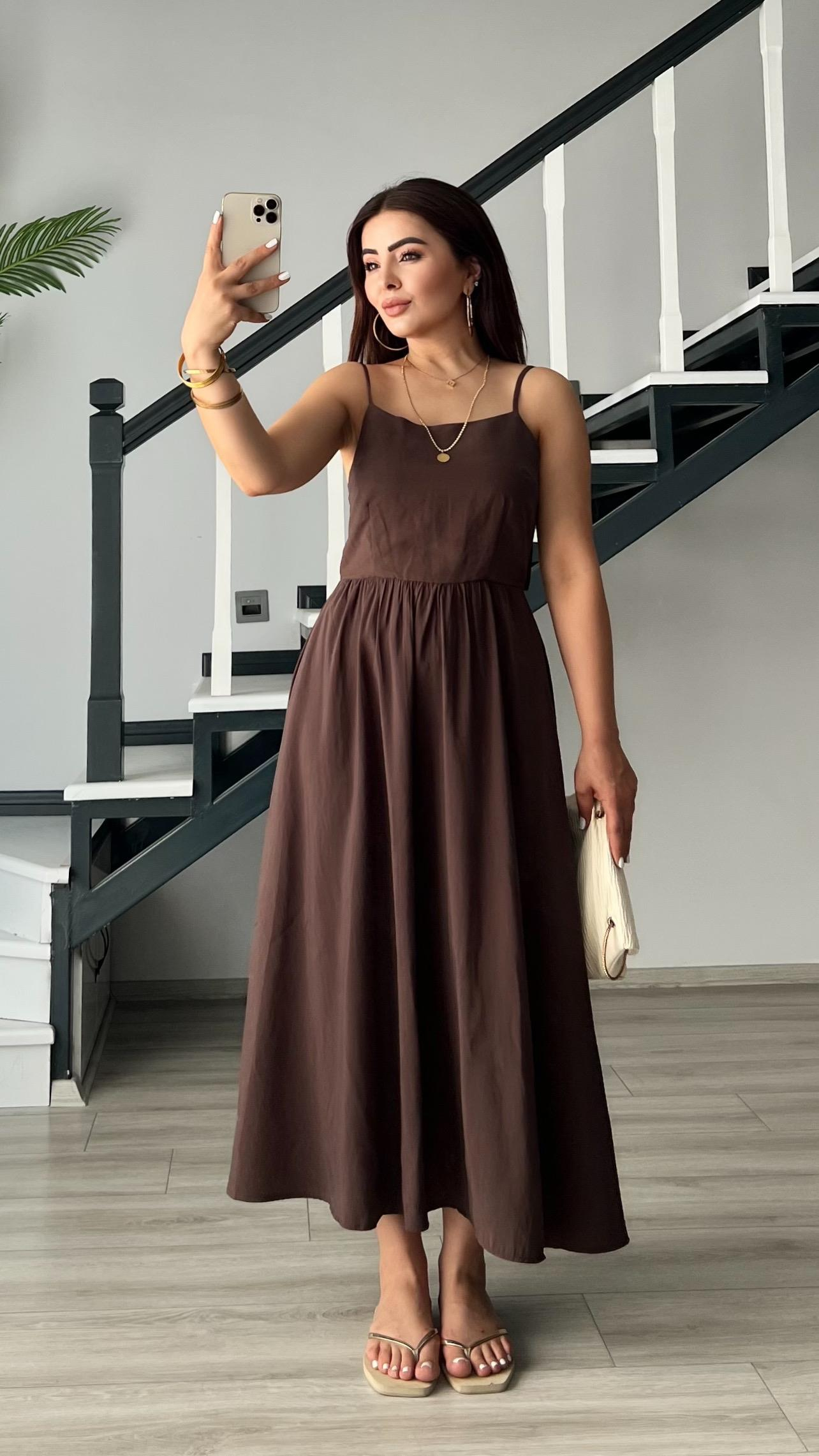 Acı Kahve Modal Sırt Bağlama Detaylı Midi Elbise