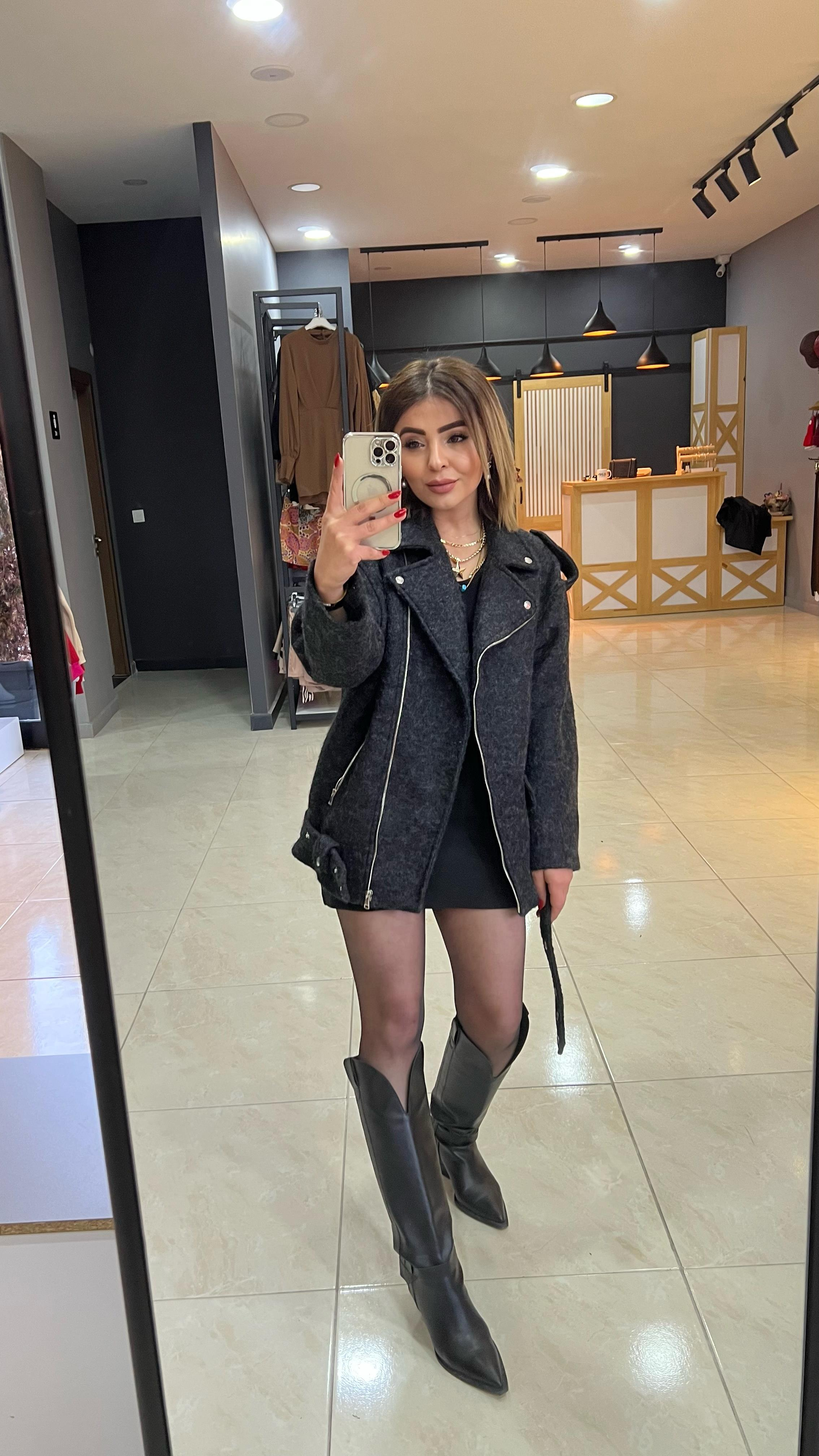 Antrasit Astarlı Yün Karışımlı Biker Mont