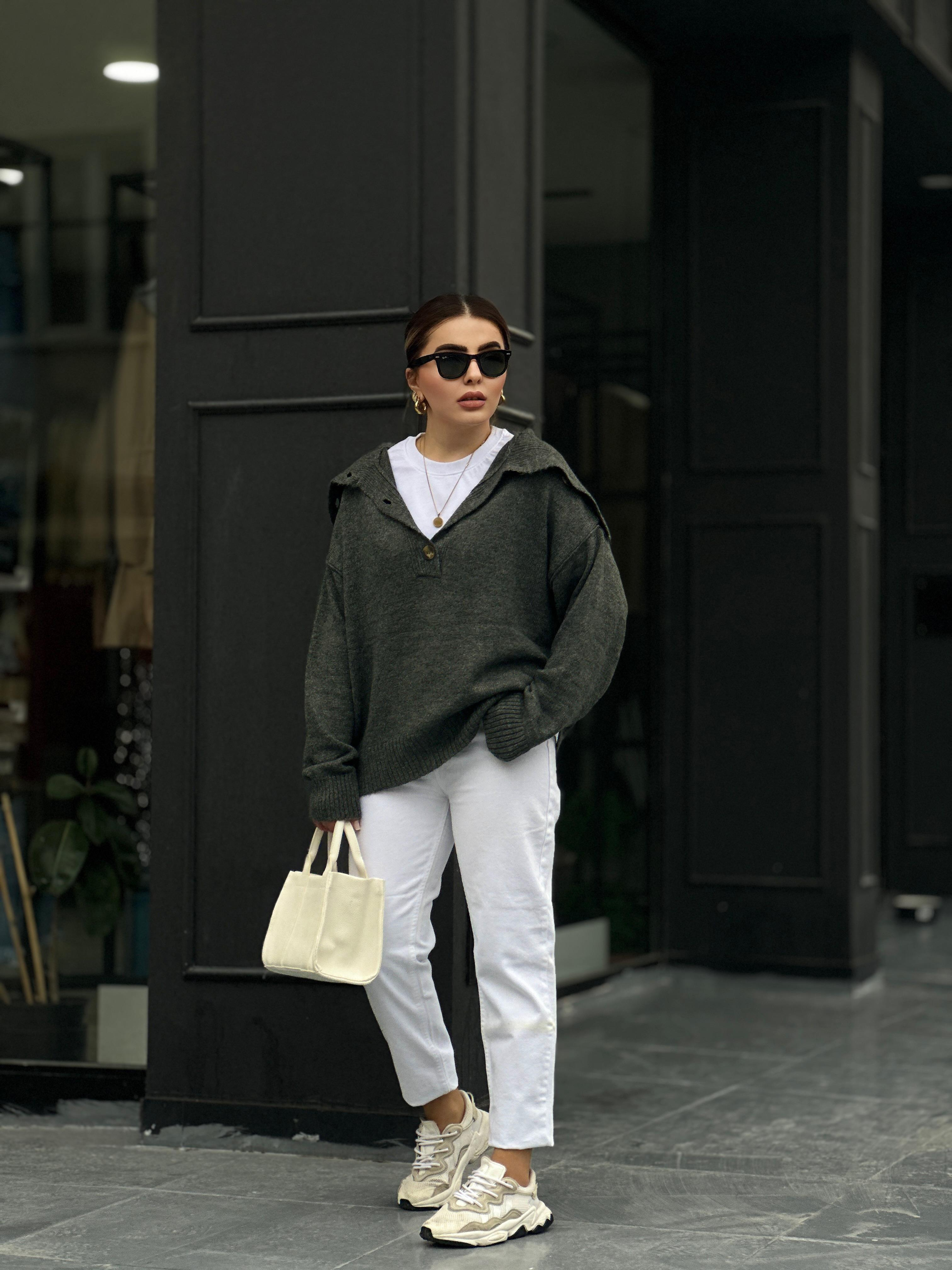 Antrasit Salaş Şal Yaka Düğmeli Kazak