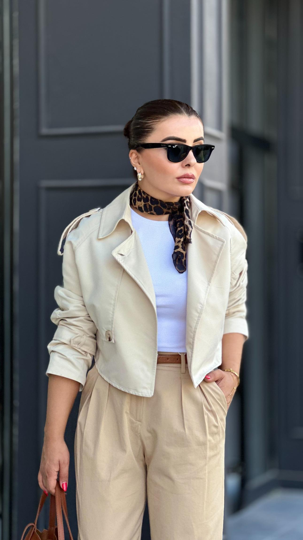 Bej Kolları Kemer Detaylı Kısa Trençkot