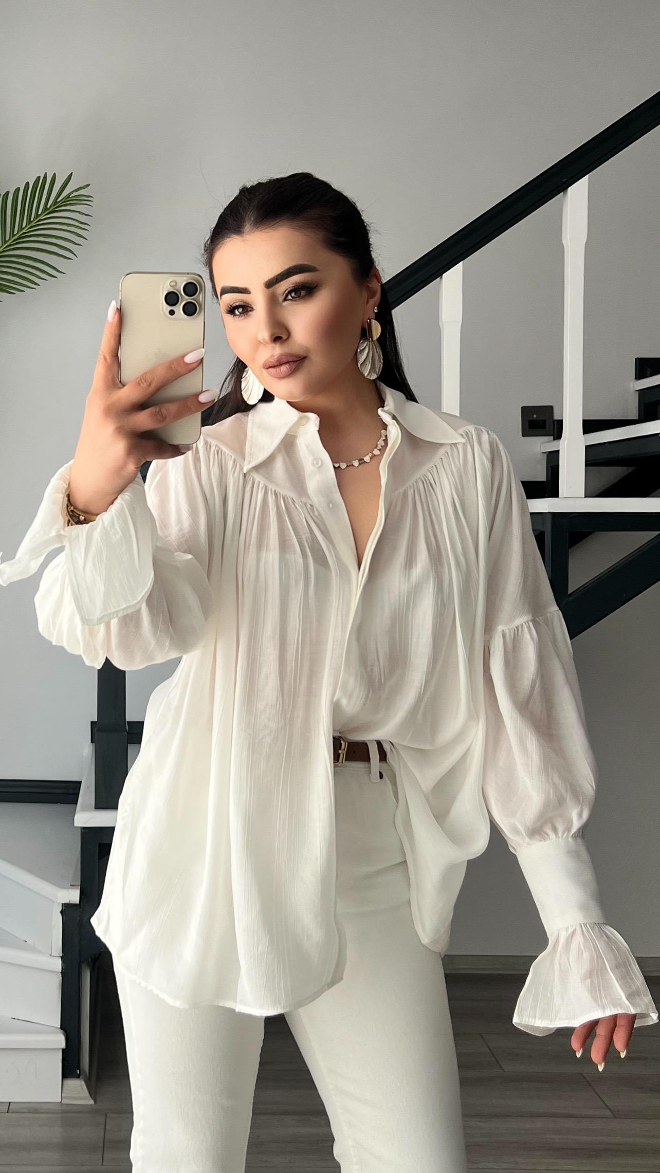 Beyaz Büzgü Ve Kol Detaylı Gömlek