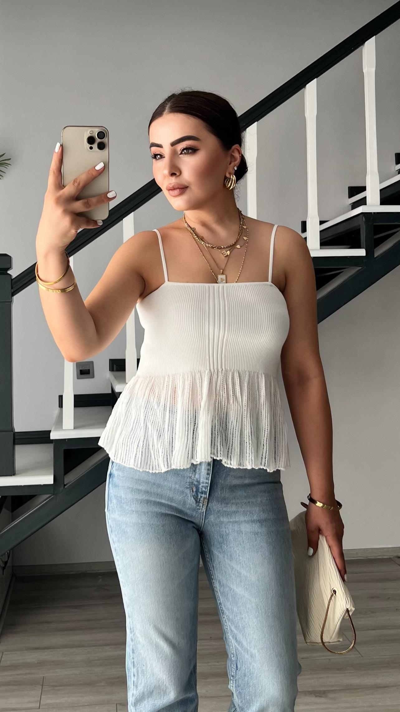 Beyaz İnce Askılı Volanlı Triko Bluz