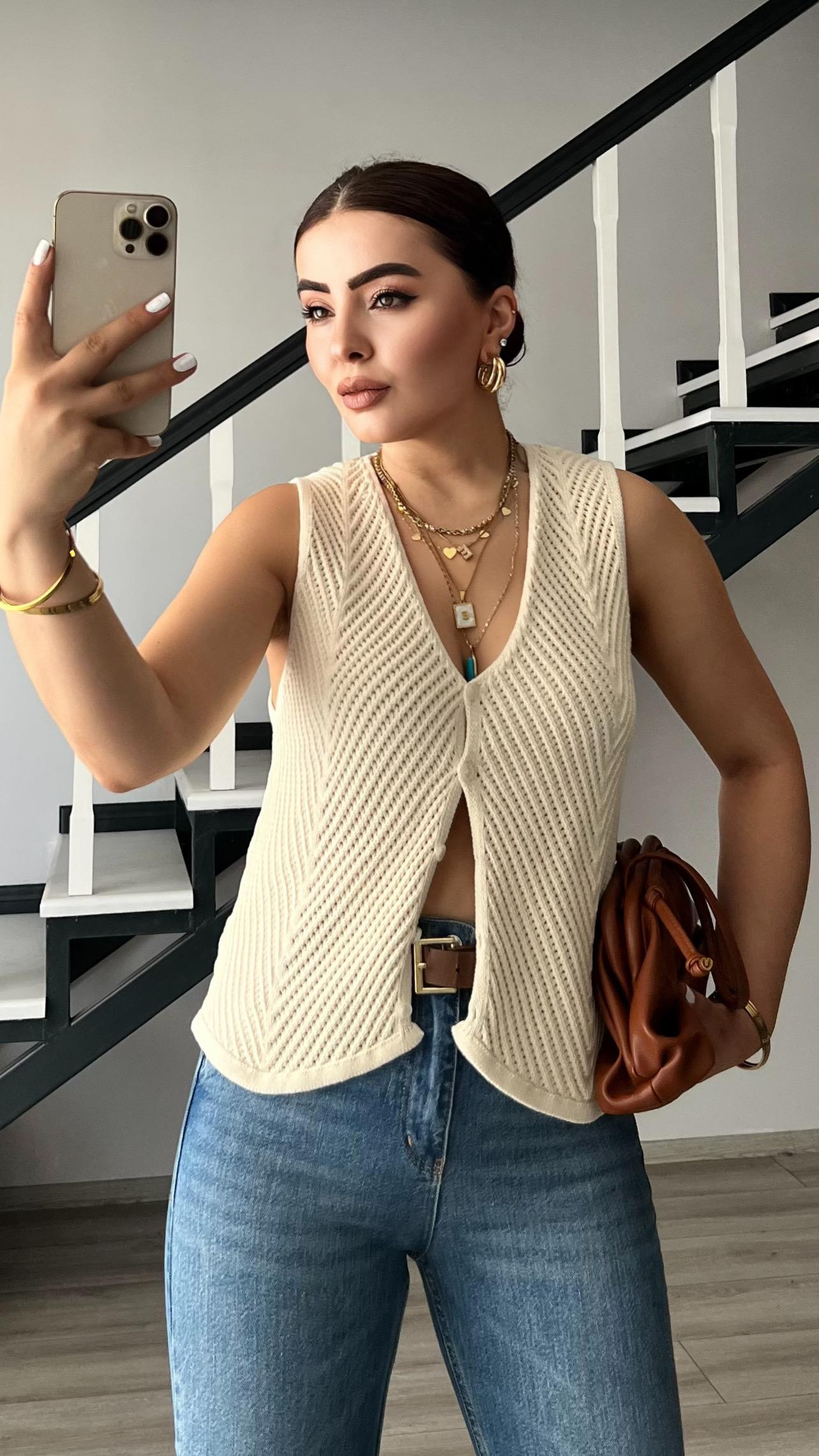 Ekru 5 Düğme Triko Yelek