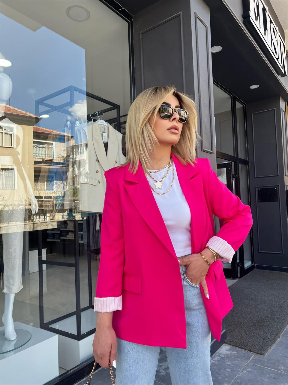 Fuşya Astarı Çizgili Atlas Kumaş Blazer Ceket
