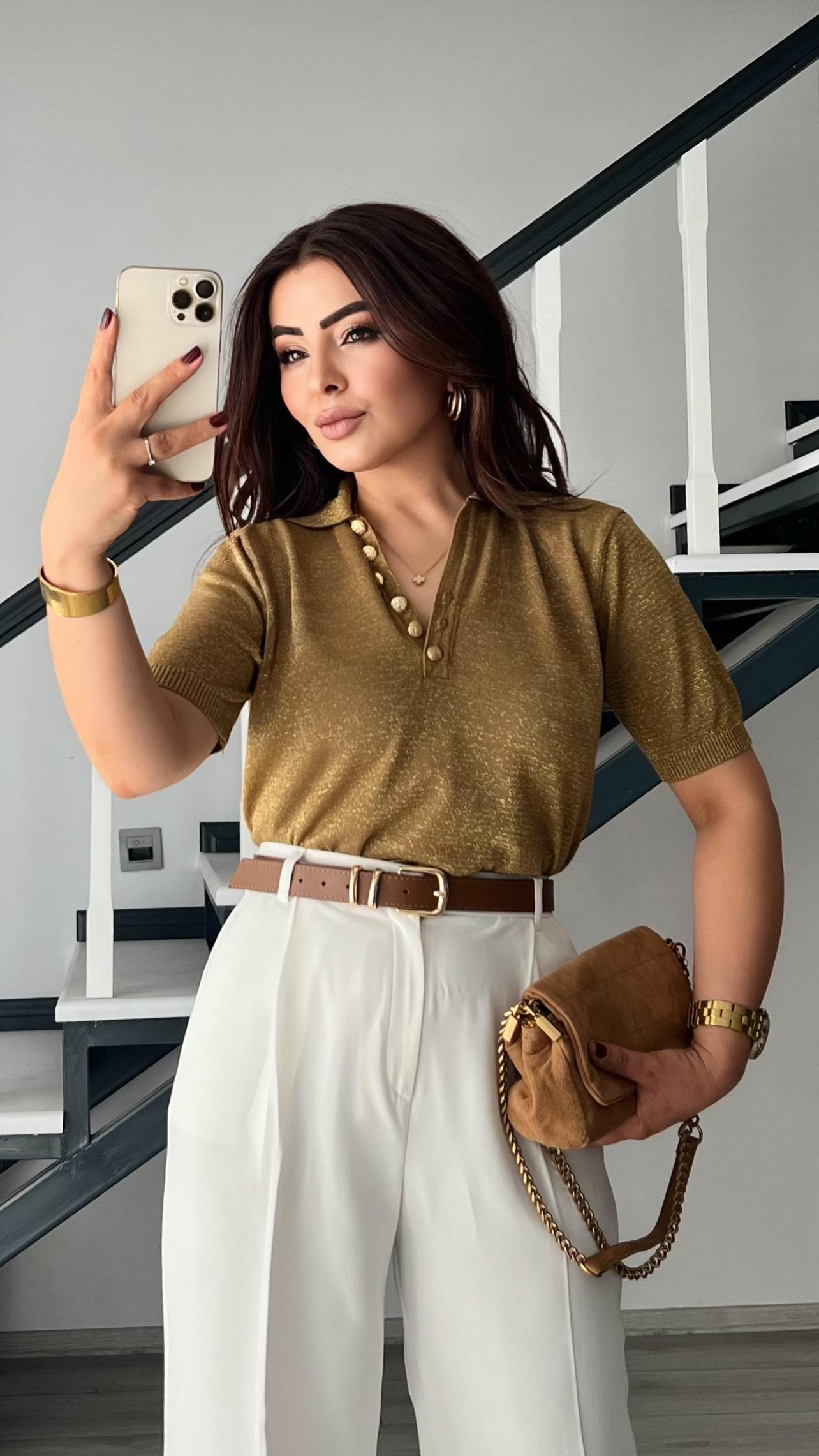 Gold Düğmeli Simli Kısa Kol Triko Bluz