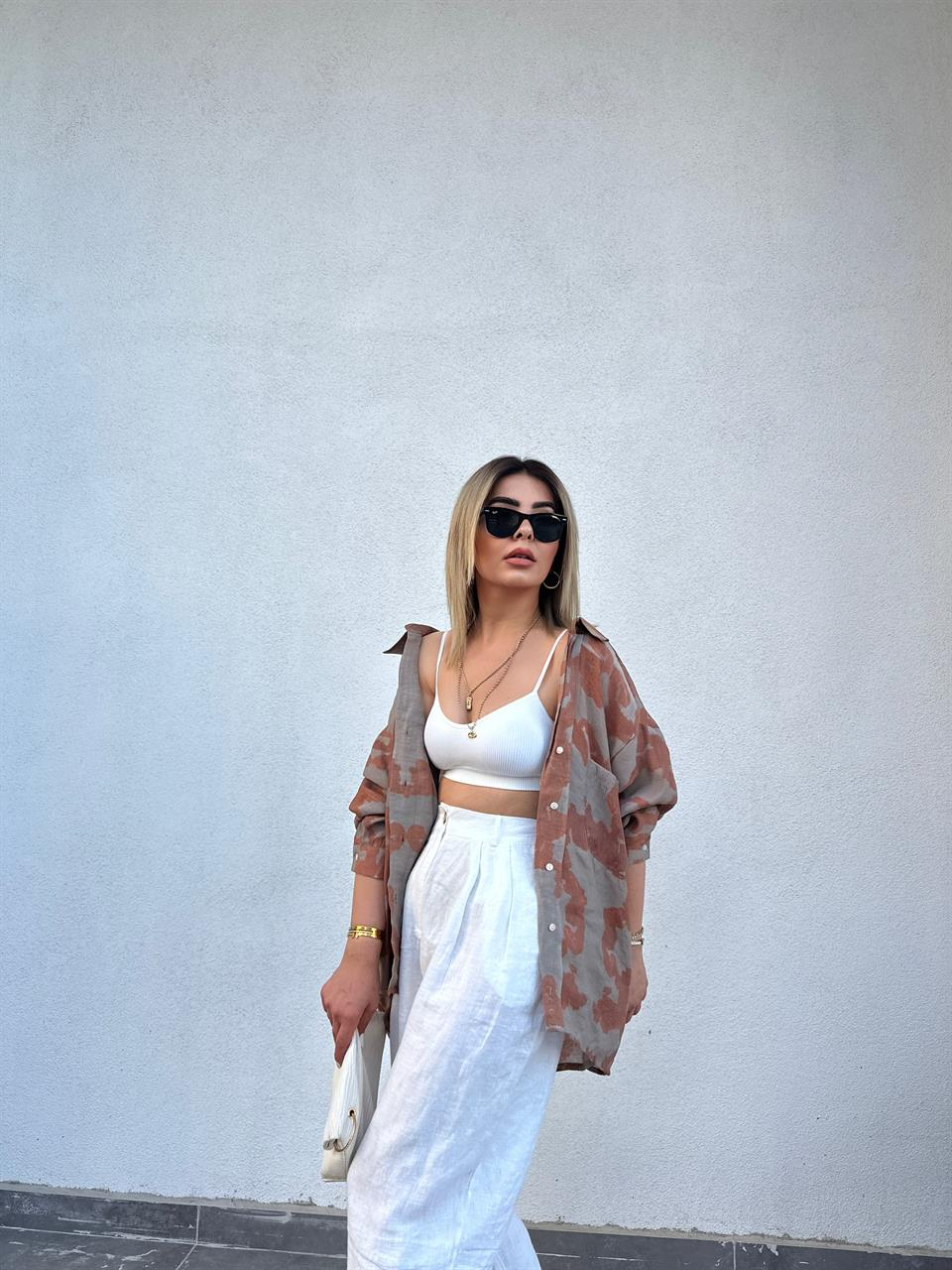 Kahve Desenli Oversize Tensel Gömlek