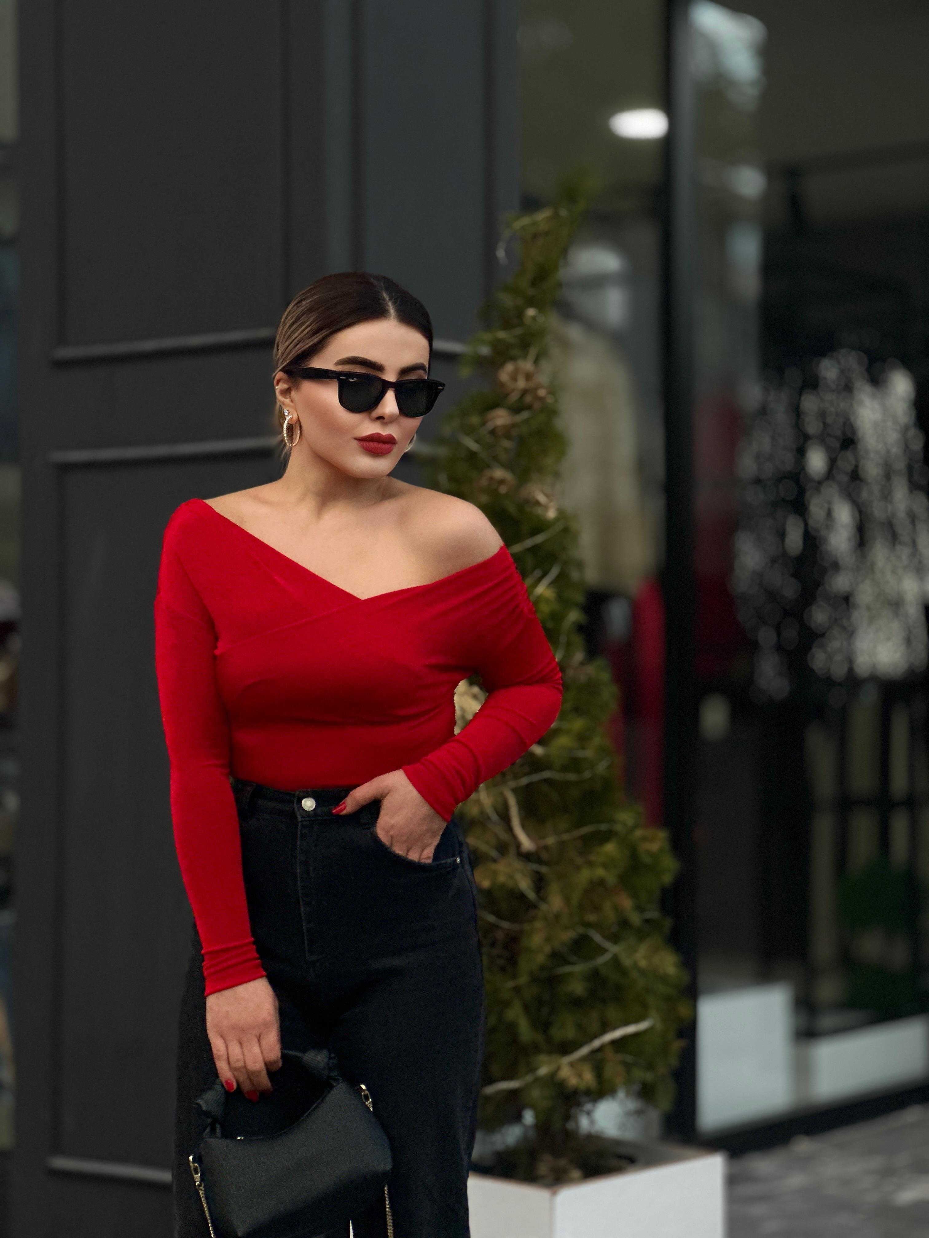 Kırmızı Asimetrik Omuz Detaylı Kruvaze Bluz