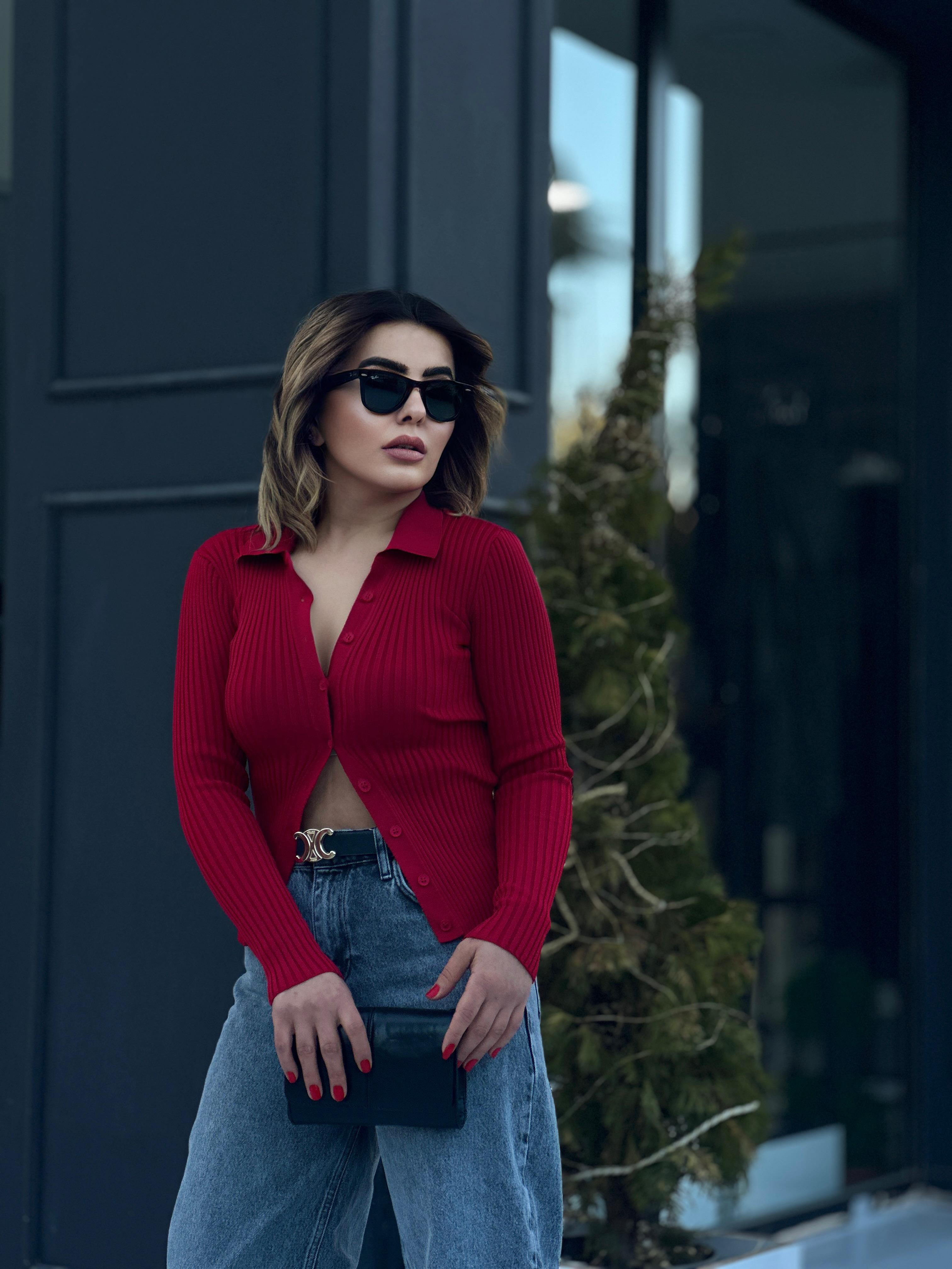 Kırmızı Polo Yaka Çelik Örme Düğmeli Triko Bluz