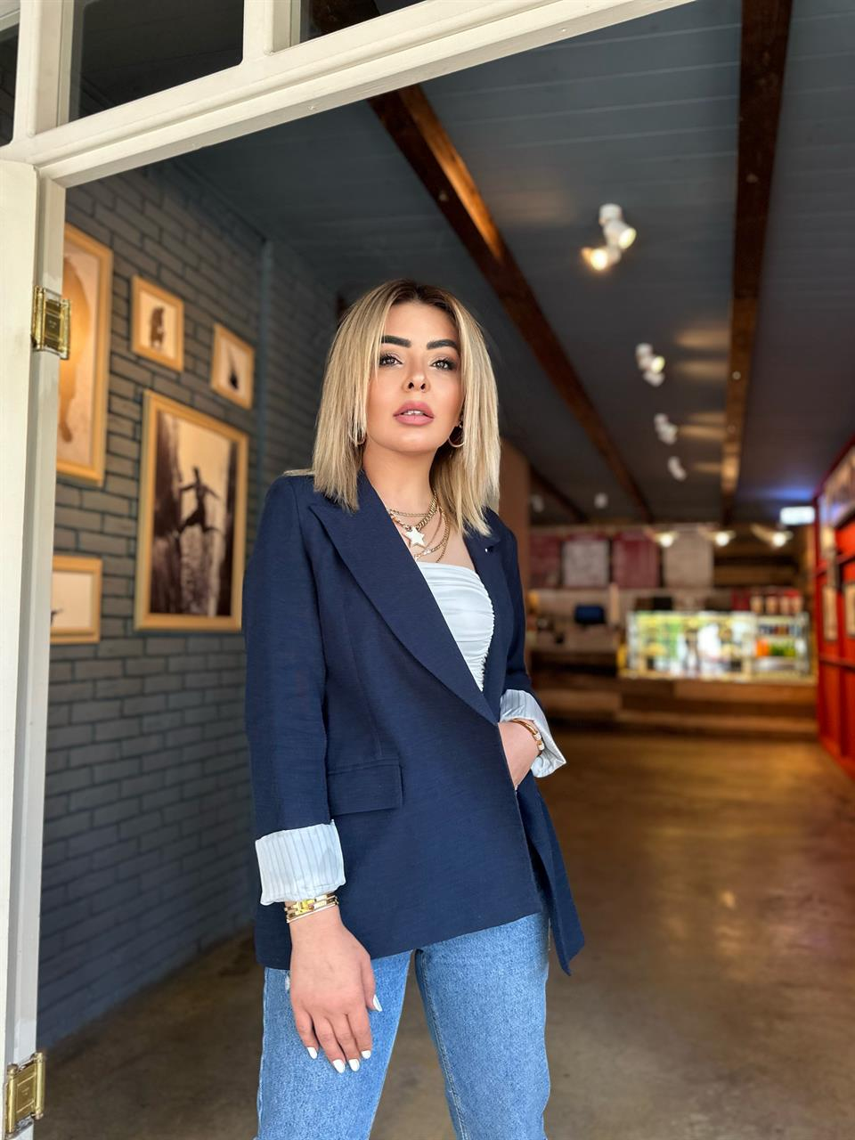 Lacivert Keten Astarı Çizgili Blazer Ceket