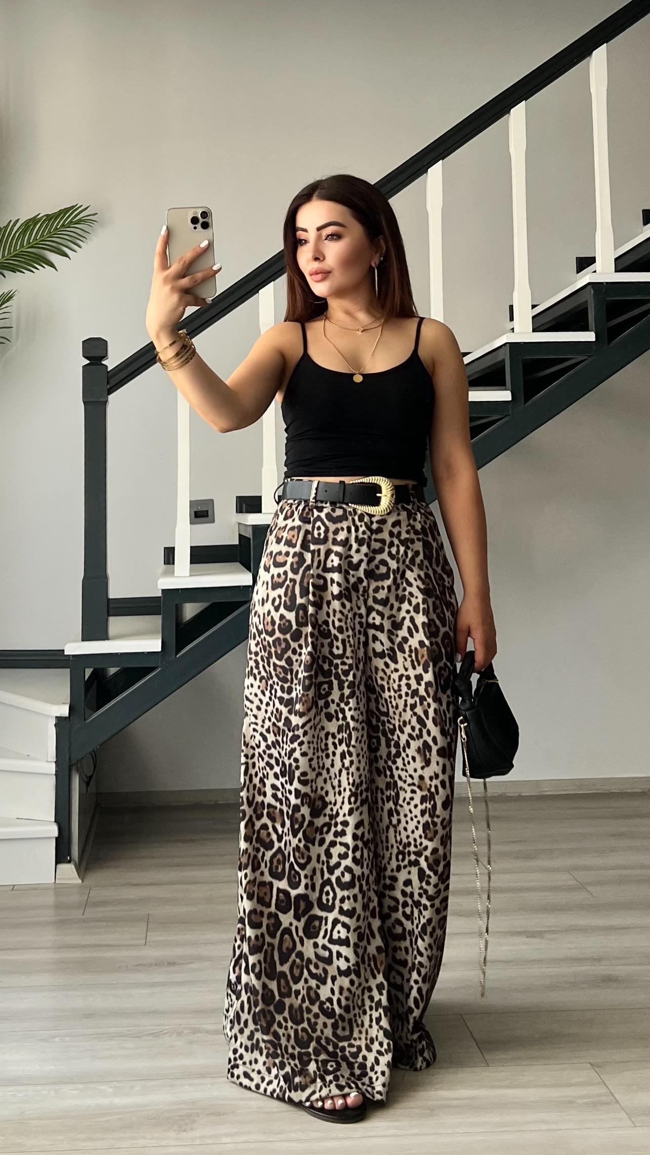 Marka Model Leopar Desen Kemerli Saten Pantolon