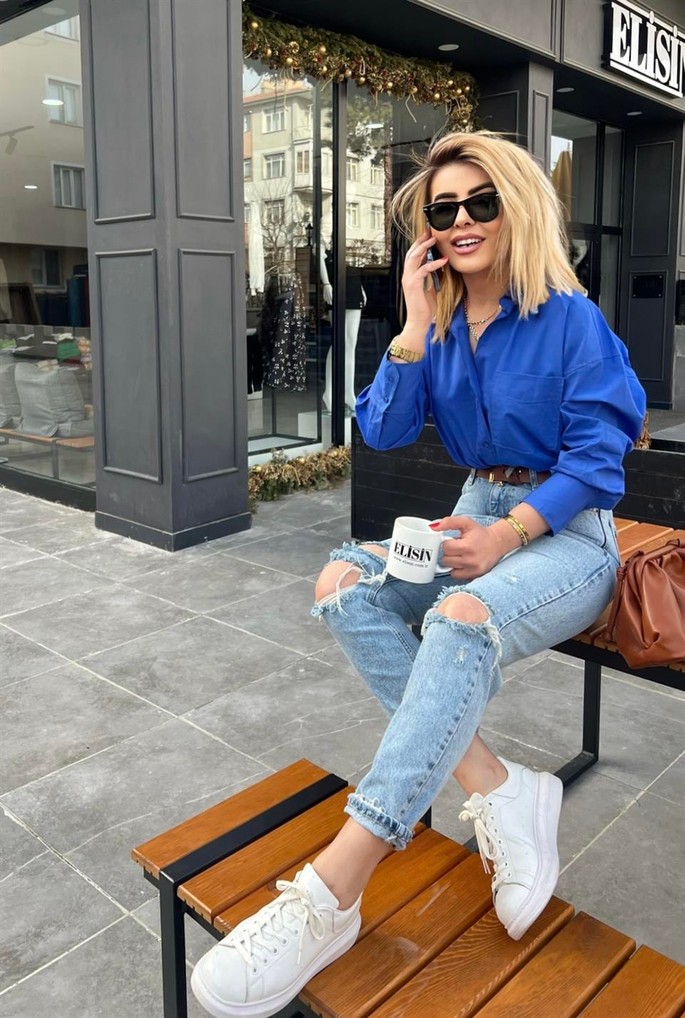 Saks Mavi Önü Tek Cepli Oversize Gömlek