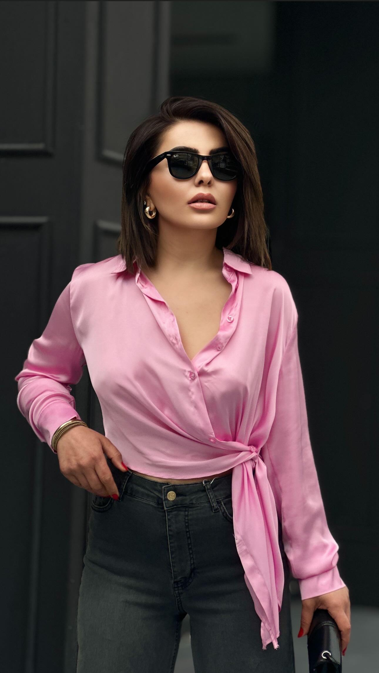 Şeker Pembe Saten Bağlama Detaylı Gömlek