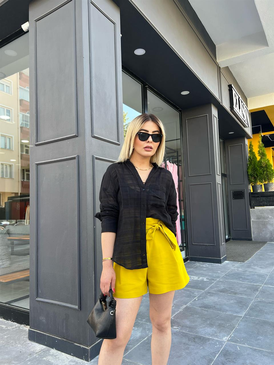 Siyah Kendinden Dokulu Yarı -Transparan Gömlek