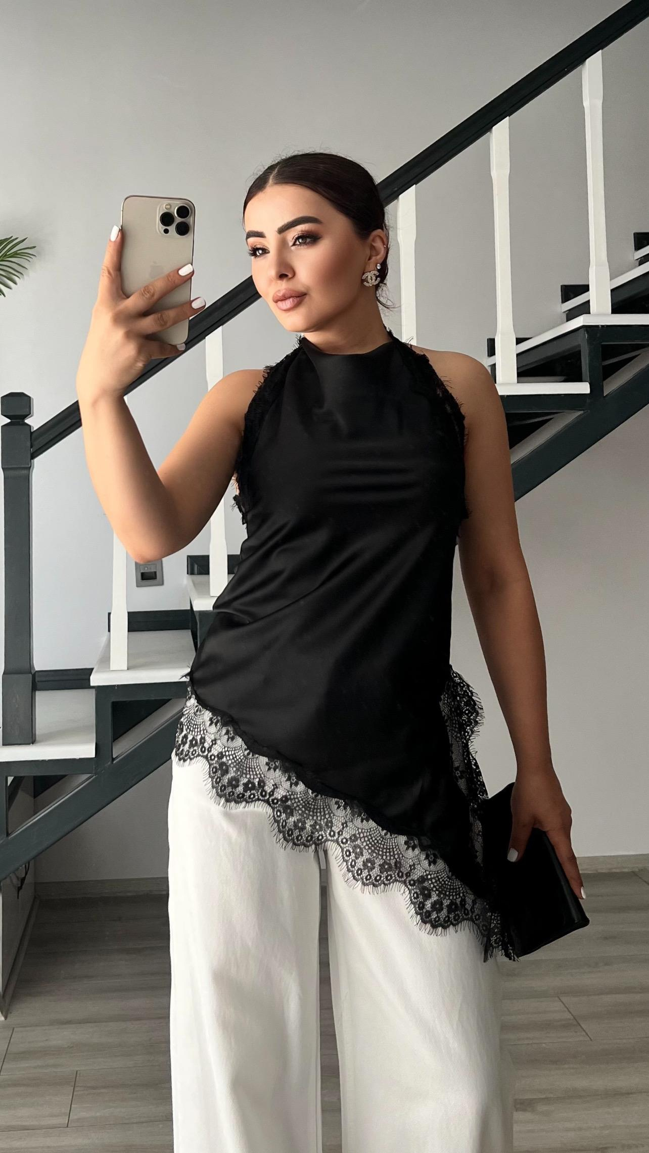 Siyah Premium Saten Dantel Bluz