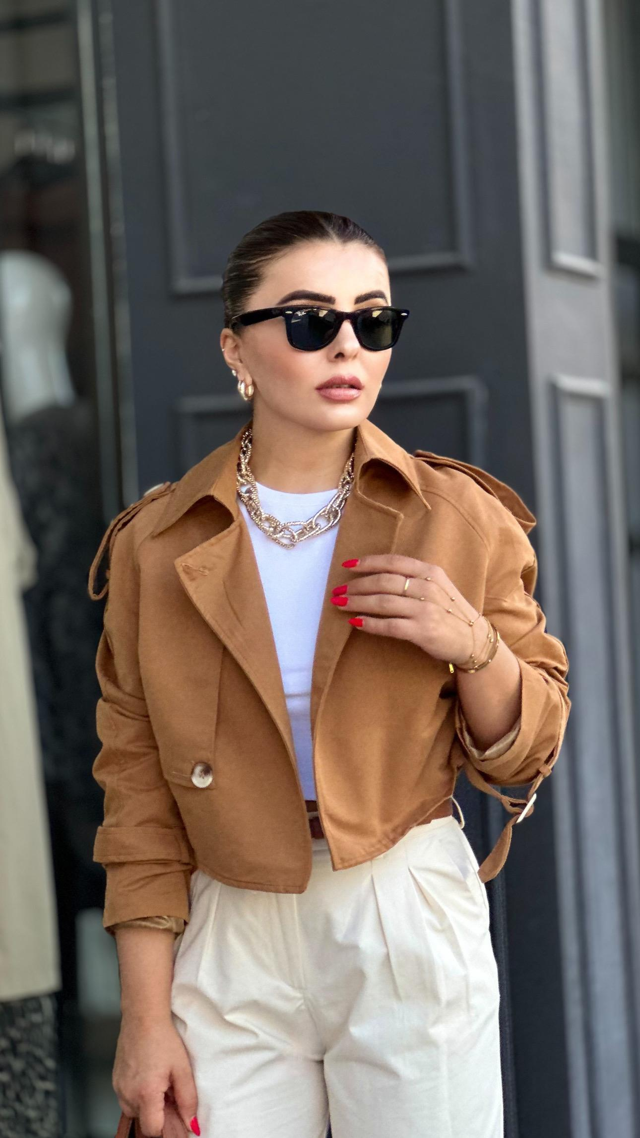 Taba Kolları Kemer Detaylı Kısa Trençkot